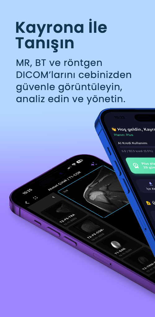 Kayrona; DICOM görüntüleme deneyimiyle AI destekli analiz akışını tek bir üründe birleştirir. Hızlı görüntüleme, net rapor akışı ve modern bir kullanıcı deneyimi.